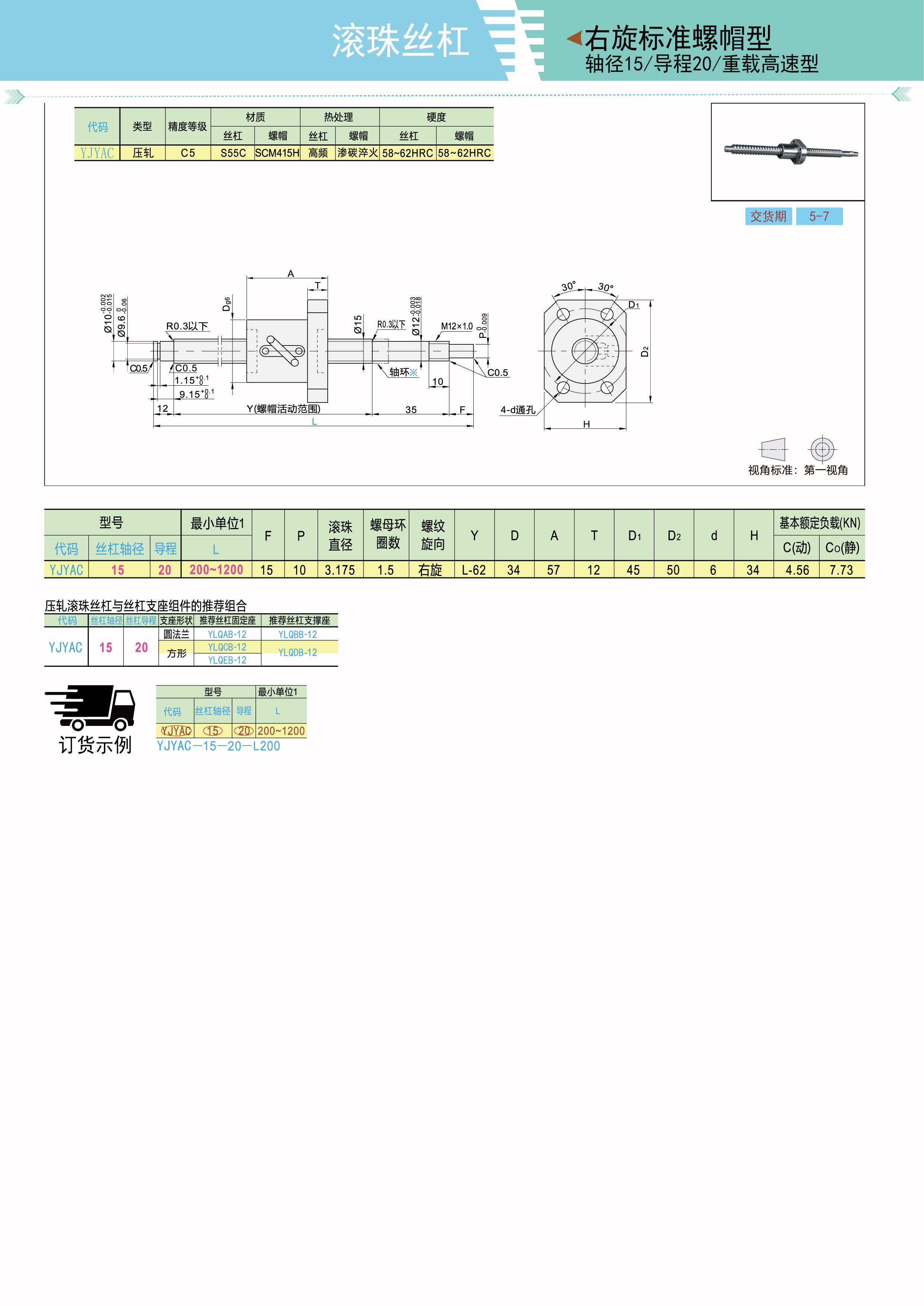 压轧滚珠丝杠 右旋标准螺帽型 重载高速型 轴径15 精度C5