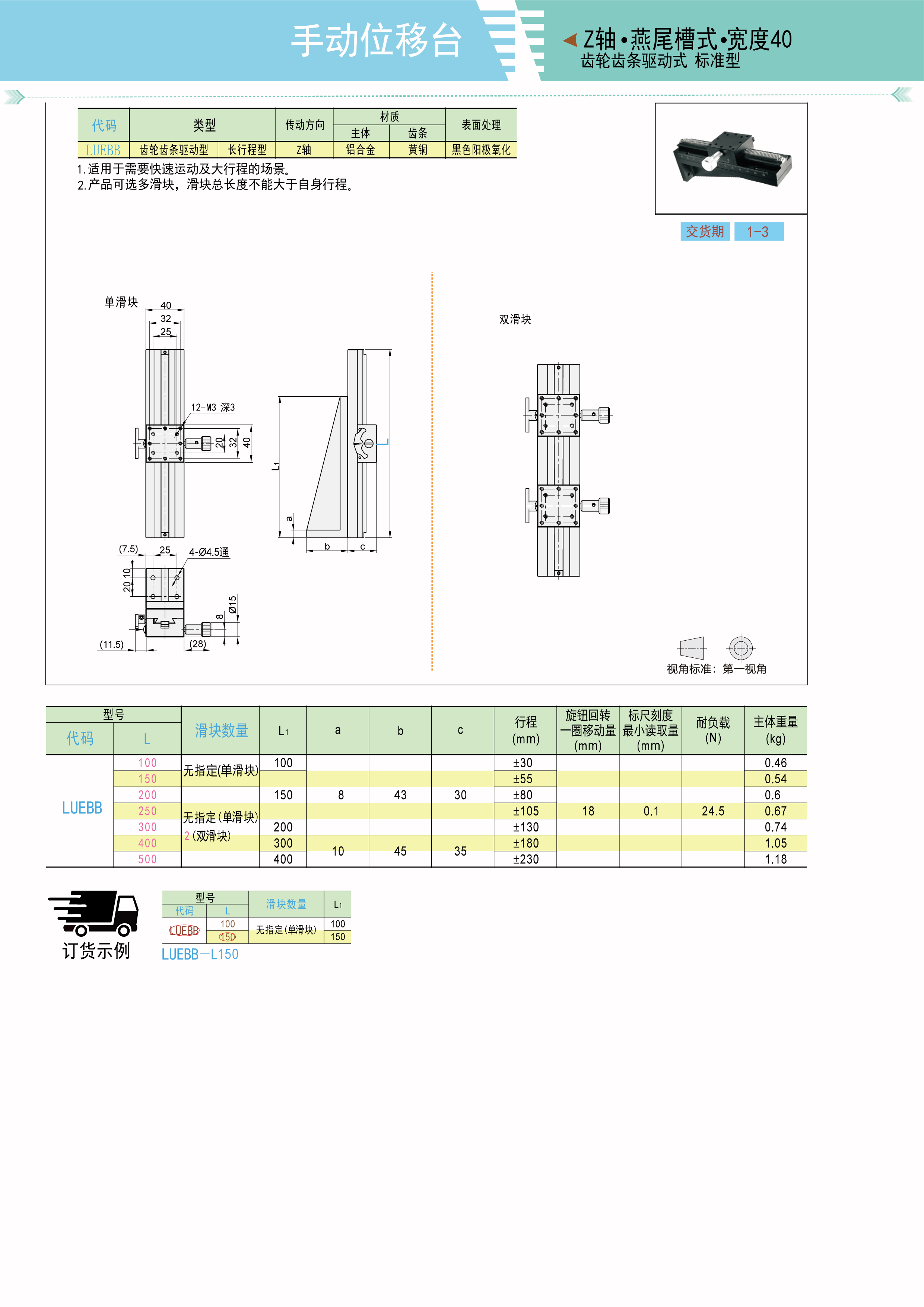 手动位移台 Z轴 燕尾槽式 齿轮齿条驱动型 宽度40 长行程型 标准型