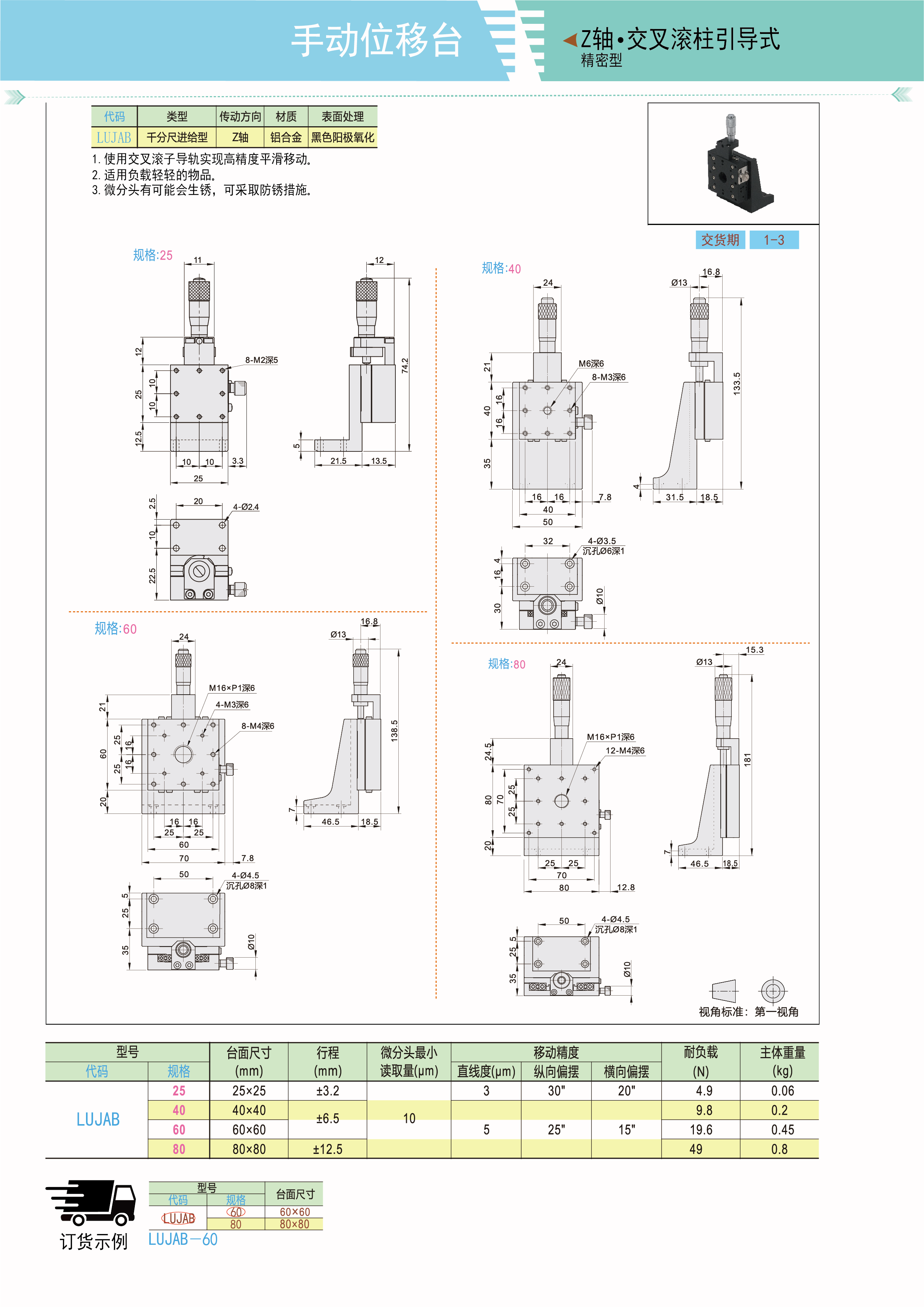 手动位移台 Z轴 交叉滚柱引导式 千分尺进给式 精密型