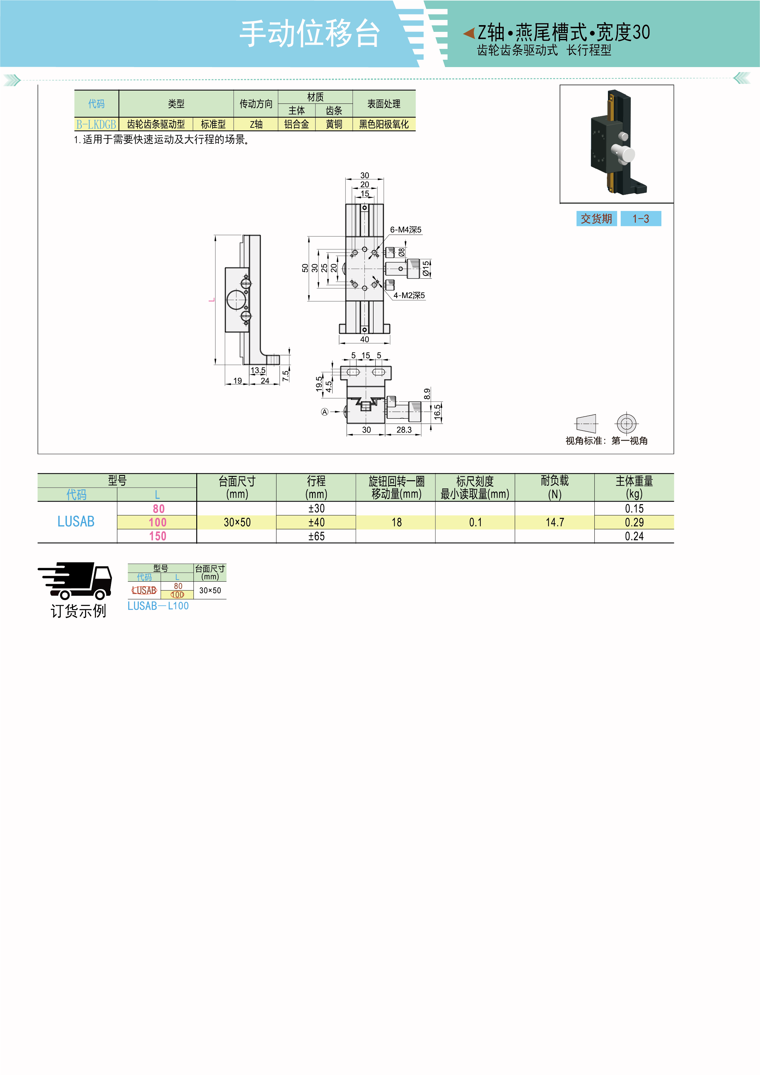 手动位移台 Z轴 燕尾槽式 宽度30 长行程齿轮齿条驱动式