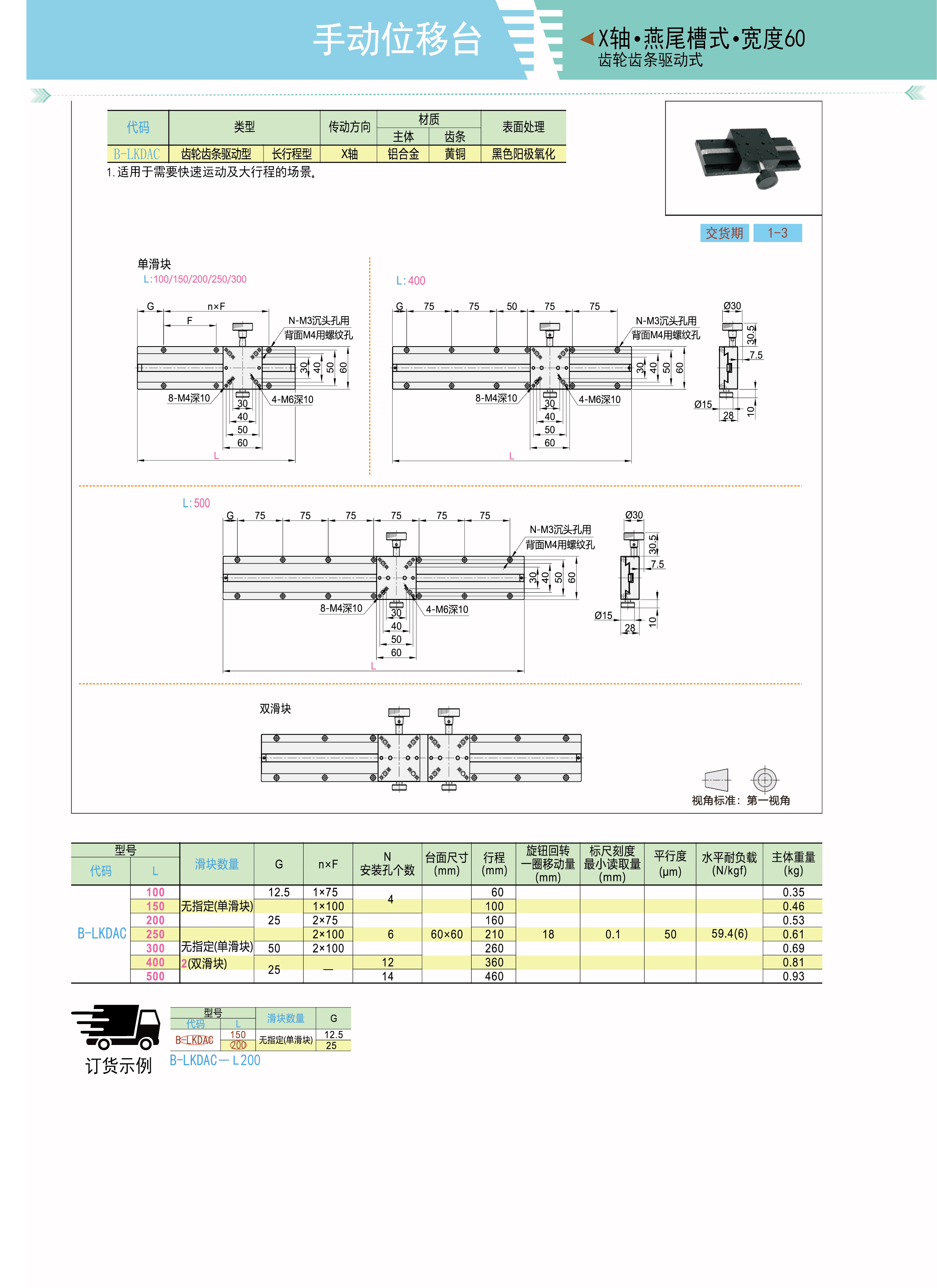 手动位移台 X轴 燕尾槽式 宽度60 长行程齿轮齿条驱动式