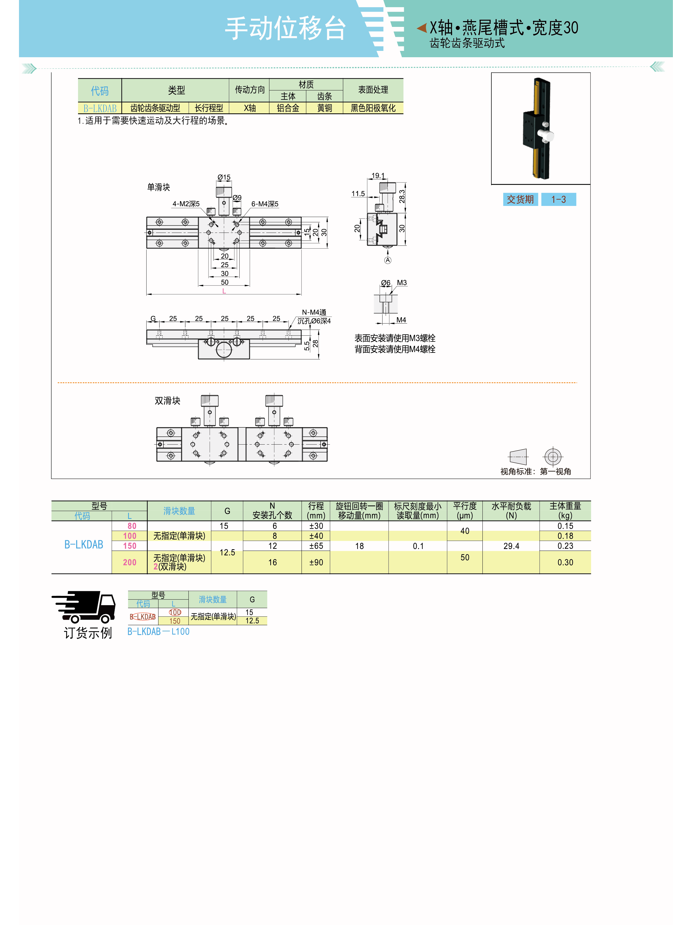 手动位移台 X轴 燕尾槽式 宽度30 长行程齿轮齿条 驱动式
