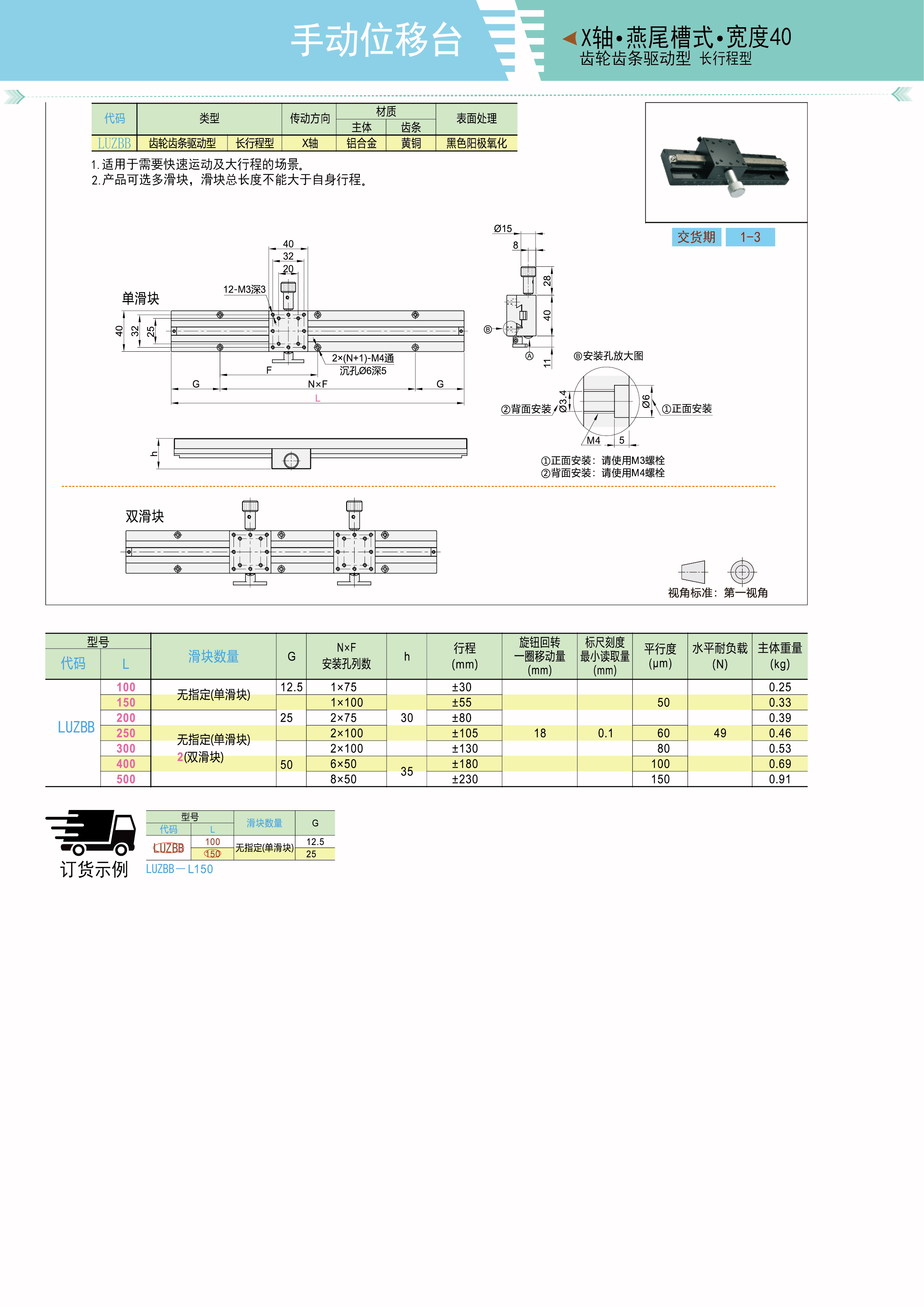 手动位移台X轴 燕尾槽式 齿轮齿条驱动型 宽度40 长行程型 标准型