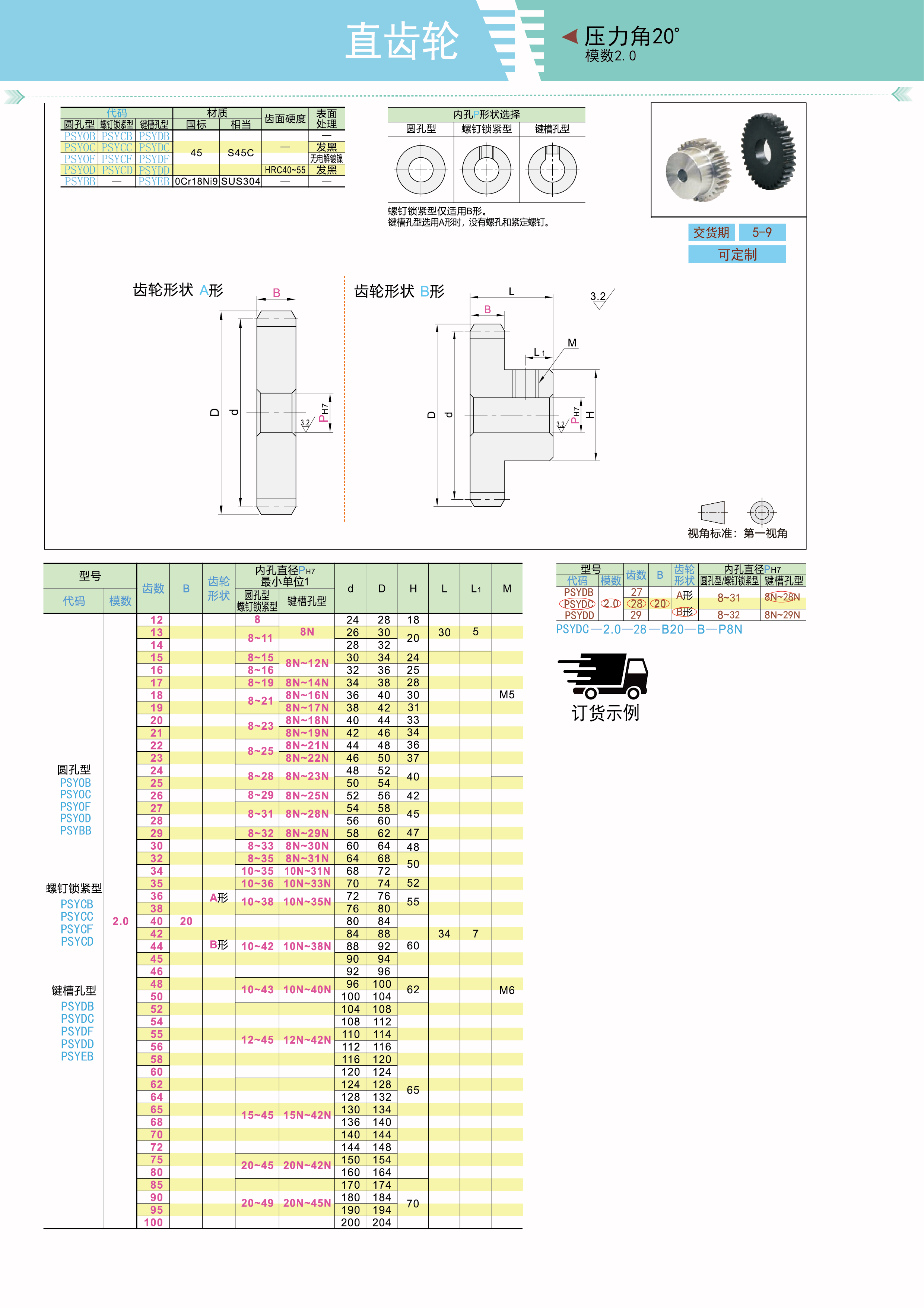 标准直齿轮 压力角20° 模数2.0 圆孔型 螺钉锁紧型 键槽孔型