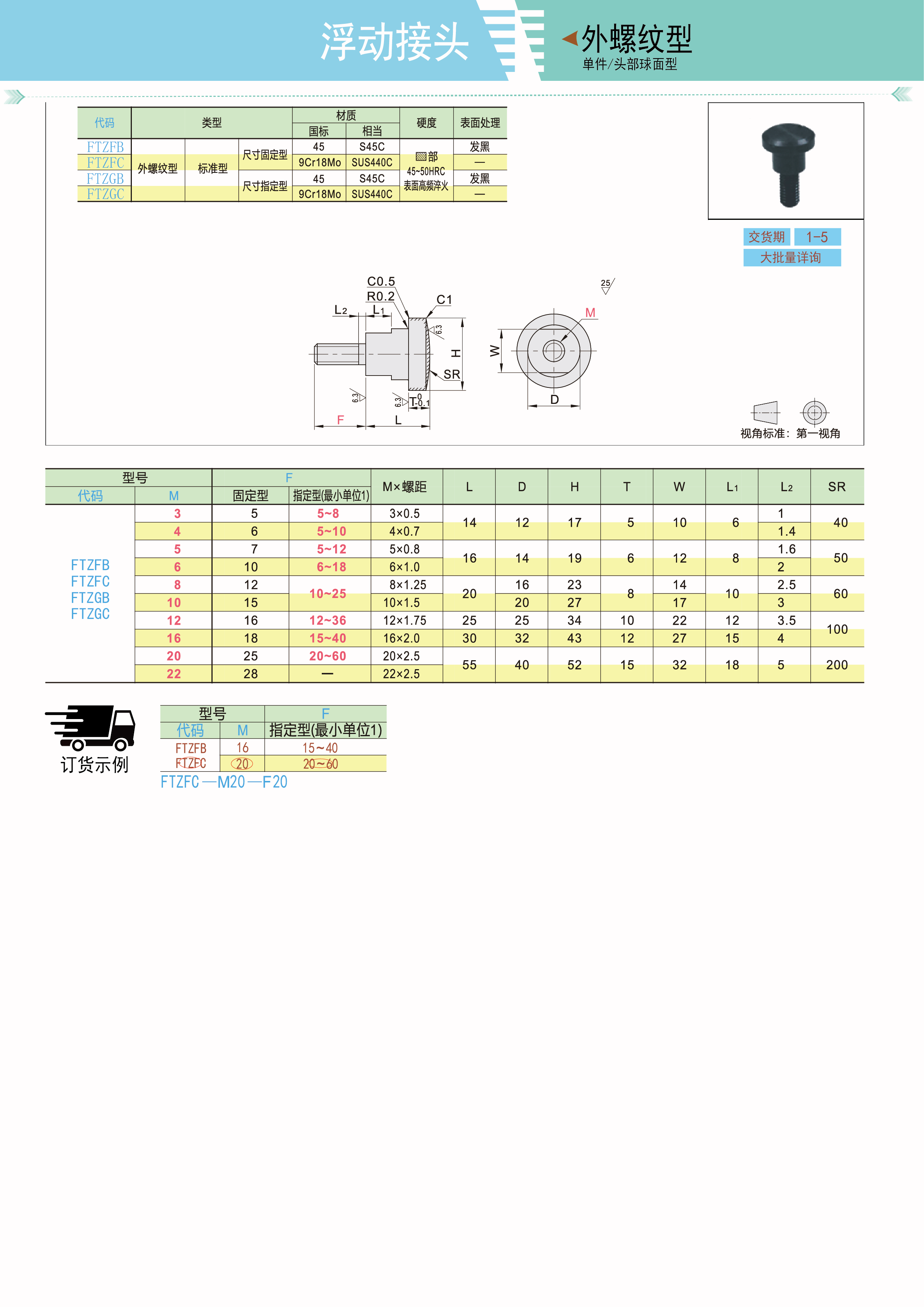 浮动接头 单件 头部球面型 外螺纹型 标准型 尺寸固定型 头部球面型
