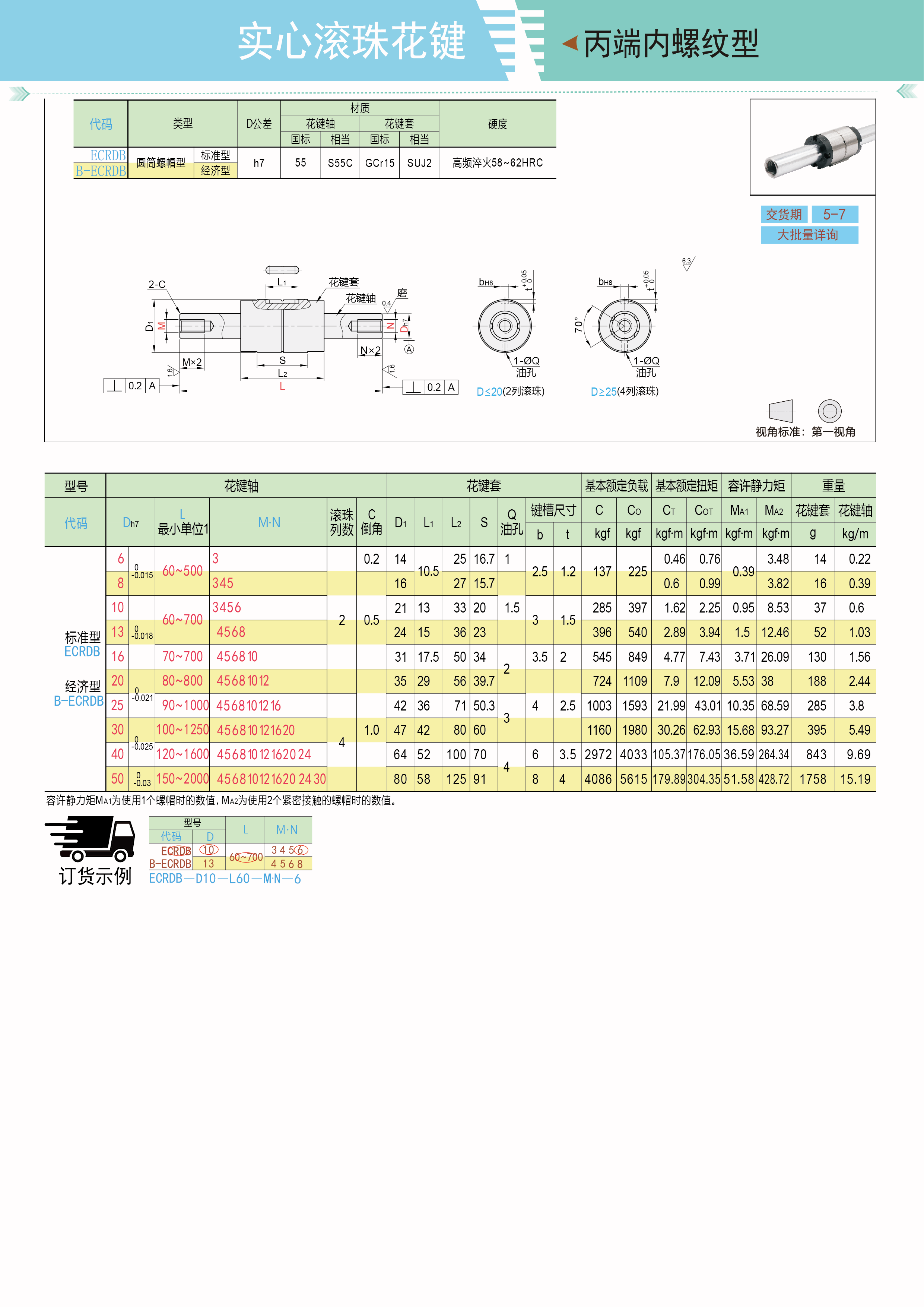 实心滚珠花键 丙端内螺纹型 圆筒螺帽型 标准型 经济型 轴公差h7